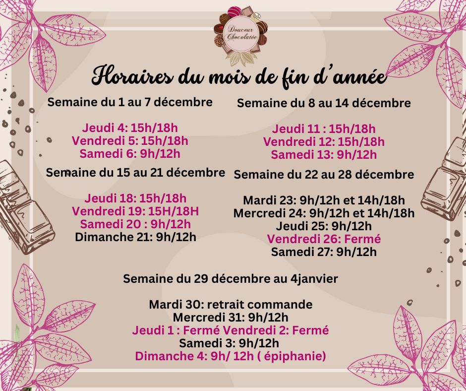 Horaires d’ouverture : Jeudi: 15H/18H, vendredi: 15H/18H et samedi : 9H/12HPlonger dans l’univers gourmand de Douceur chocolatée, fabrication de chocolats, confiseries et pâtisseries sur commande. Un atelier réservé à la production et un espace accueil pour un retrait des commandes vous attendent pour une expérience gourmande. Douceur chocolatée est un concept original. N’hésitez pas à pousser la porte, je vous accueillerai avec plaisir sur mon lieu de production. Retrait de votre commande à l’atelier.